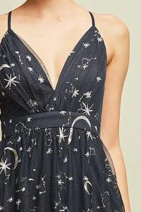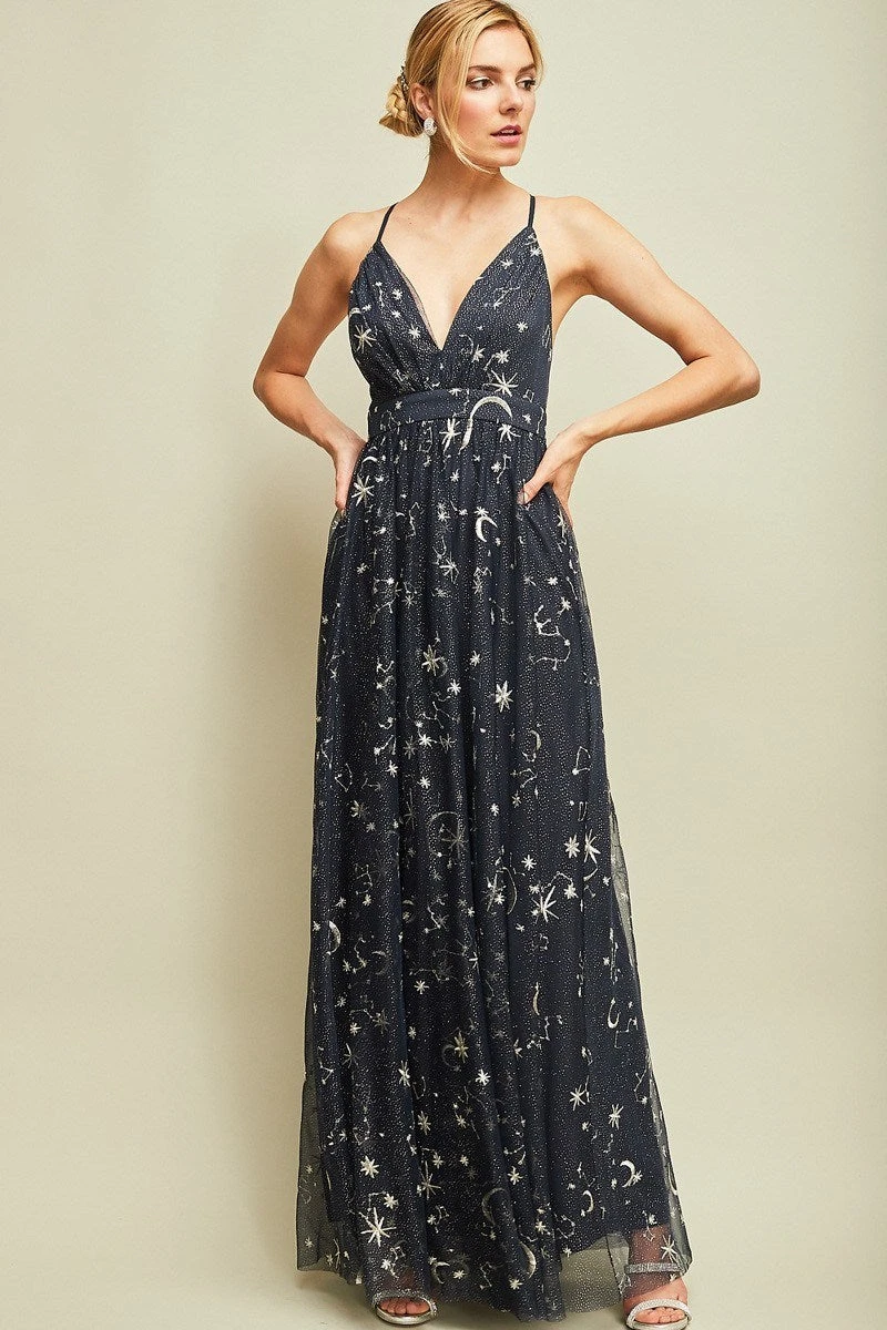 MOON, STARS Maxi Dress the most beautiful maxi I have ever seen. all the moons and stars and dippers surround the dress with its embroidery beauty. Celestial print tulle maxi dress featuring deep-neck & empire waist. Crossed adjustments straps at back, lined. Non-Sheer. Lightweight. Comes in Silver and Black/Indigo. {model wearing a small} poly/rayon/tulle
