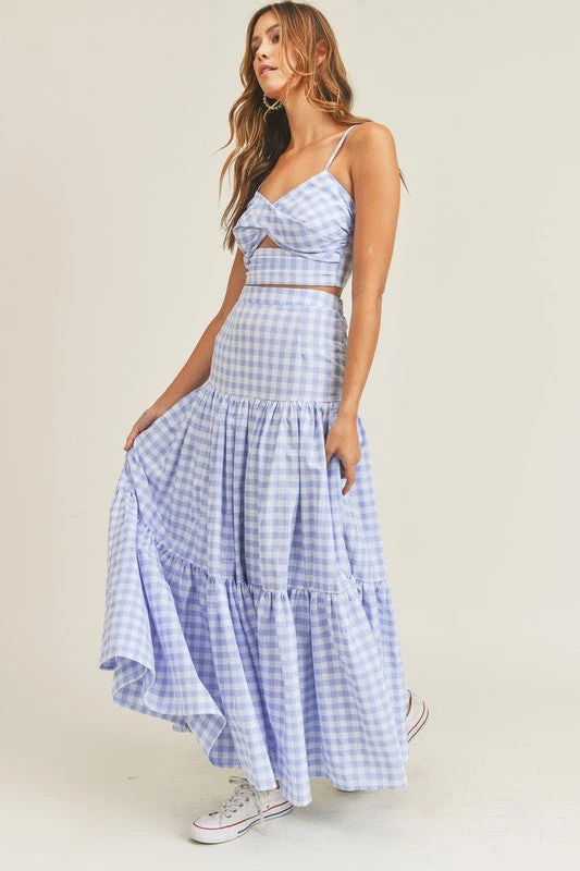 Gingham plaid adjustable spaghetti strap, twist front and cut-out tube top. Ruffle tier maxi skirt. zipper/cotton/poly