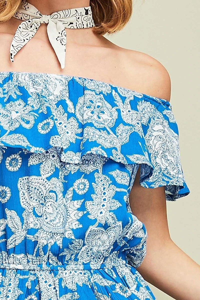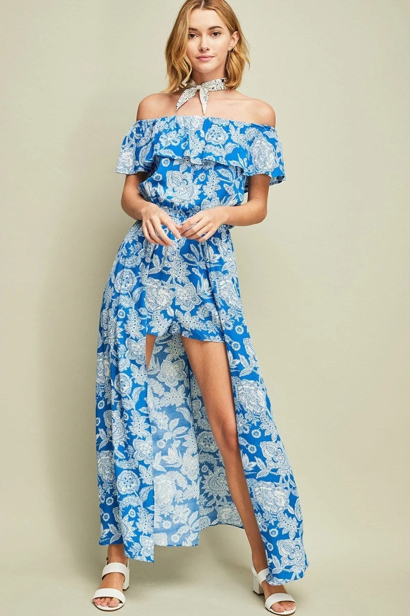 Blue Paisley Off-Shoulder Romper Hi-Low is a perfect start to any Friday night walking the street fair to Sunday brunch . Featuring a maxi skirt overlay, non-sheer, woven, light weight. Also comes in Red. modeling wearing small/ryon