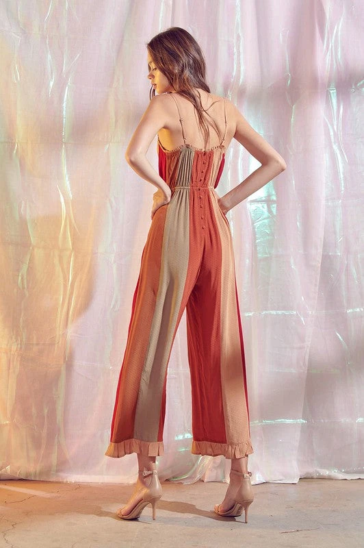 Cool toned block ruffled jumpsuit features a V-Neck with ruffled outline trim and adjustable straps, drawstring waist, ankle length with ruffled leg cuffs, functional summarys going along the back. rayon/viscose