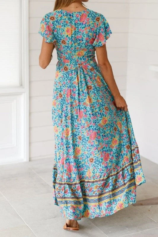 Bohemian Floral Maxi Dress in Teal, its printed short sleeves and sexy v-neck line, summary down front. Waist tie is an accent to any body type. If its not hanging in your closet, you are in luck!!. 100%cotton (also in mustard yellow and red) 2/4 small,4/6 medium,6/8 large