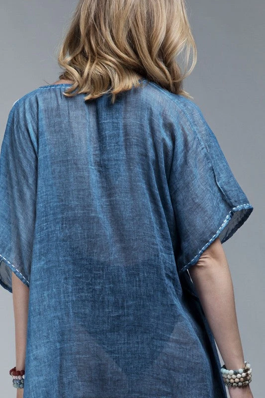 Indigo Blue embroidered flower on cover up poncho with front tie and contrasting color stitch. one-size, cotton