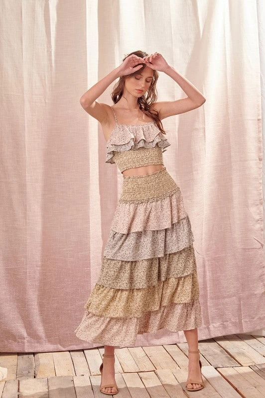 2-Piece, Olive Multi-Tiered floral skirt with smocked waist, tiered crop top with spaghetti adjustable straps, smocked hem. lined/poly