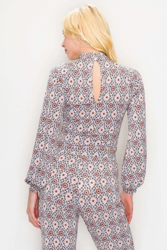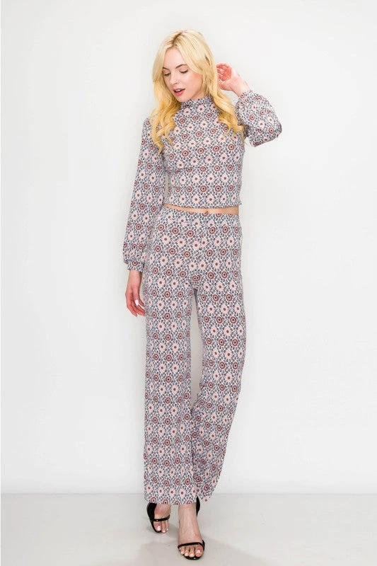 Mock Neck Top, 2 Piece fashion set, long sleeve, keyhole back, back summary. Pant, straight leg, stretchy waistband, lined. poly/spandex