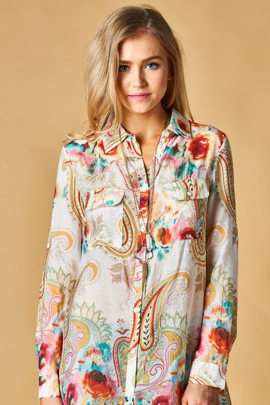 This beautiful Paisley Blouse is softened so comfortable.70%nylon/30%poly/runs big