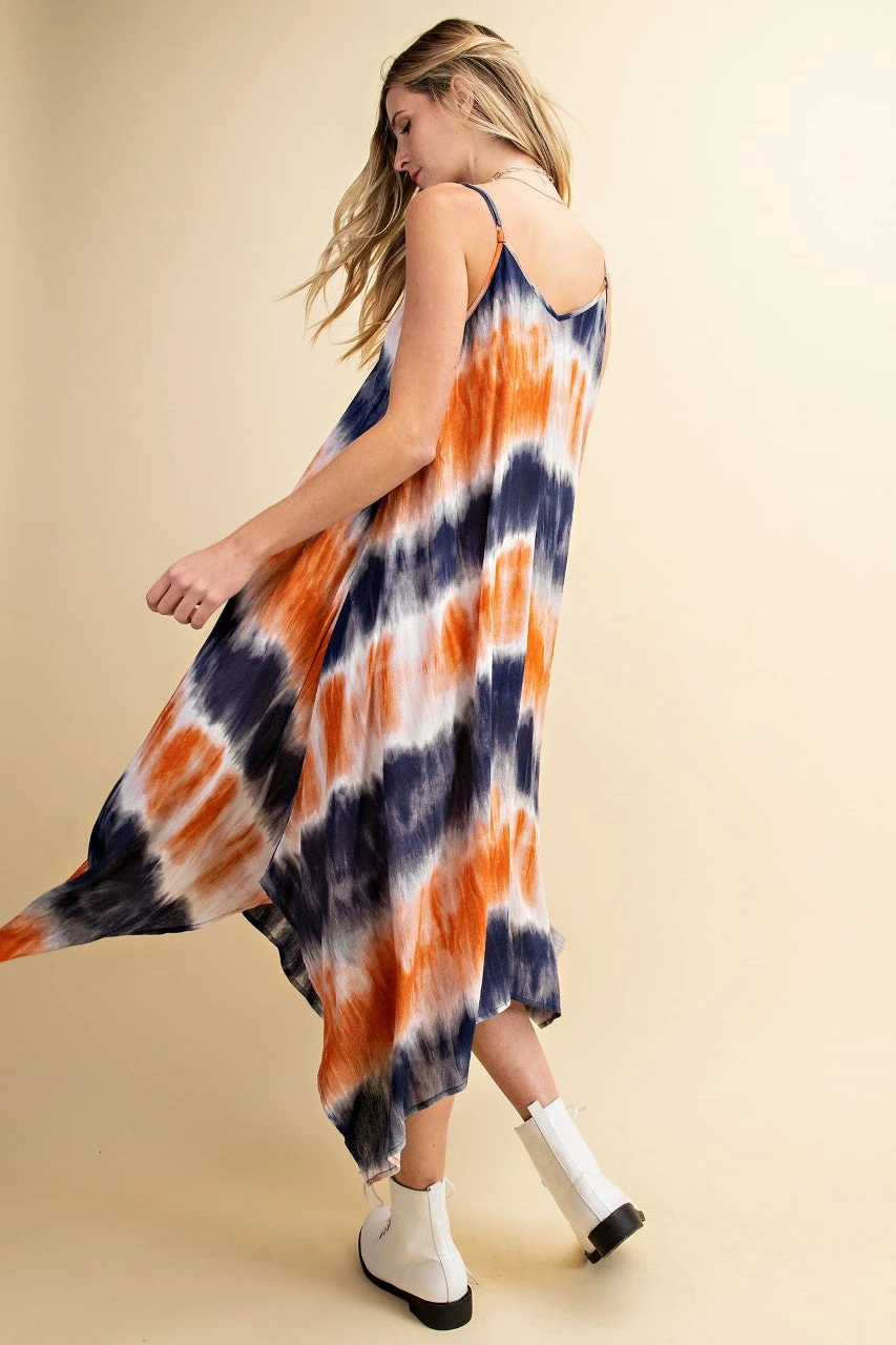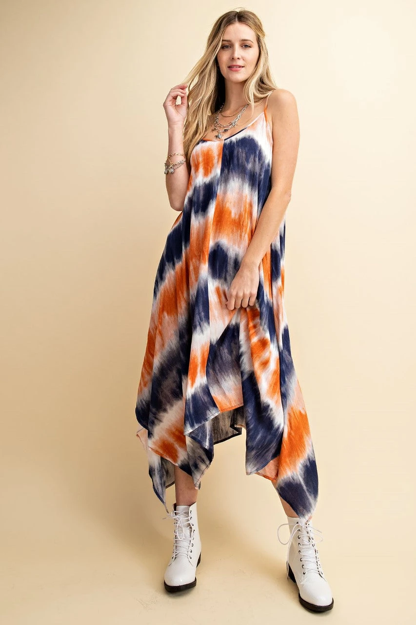 Midnight Blue/Orange combination Tie-Dye Dress with asymmetrical hem line. Rayon