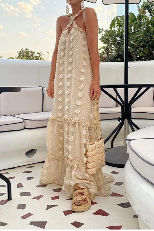 Cream criss cross front Maxi Dress with attached flowers. lined/rayon