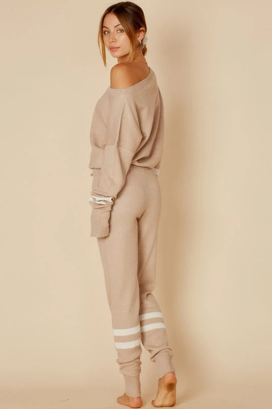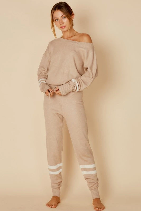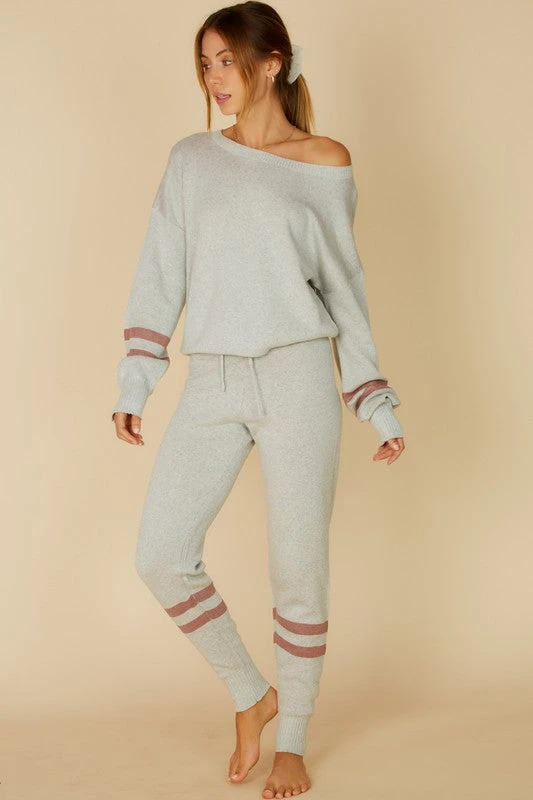 Adorable and cozy Loungewear has a stripe on the sleeve and on the bottom of the pant. Long Sleeve with tie waist string. acrylic/cotton