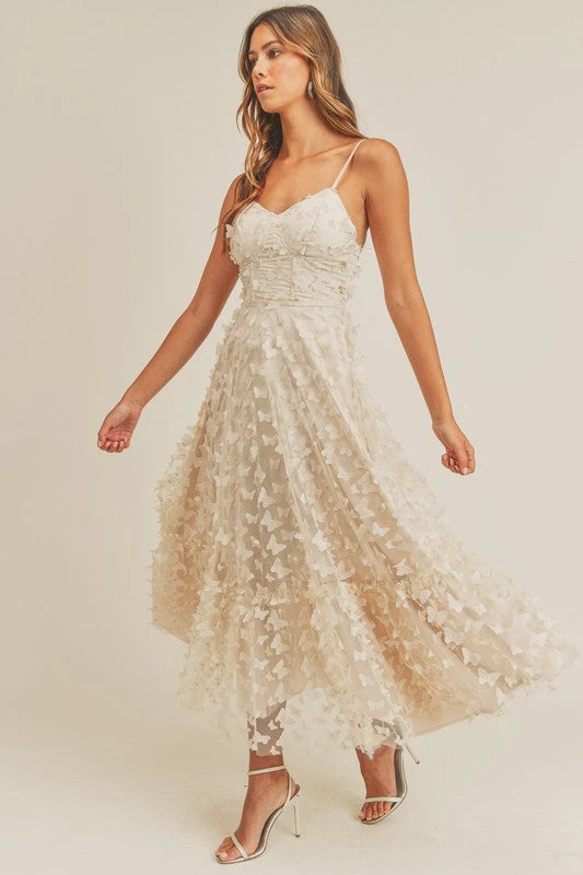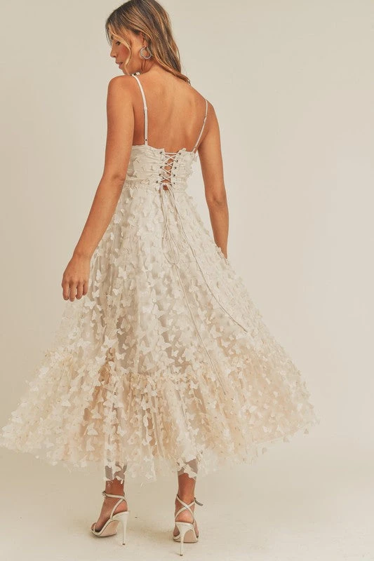 CREAM BUTTERFLY MESH LACE UP BACK BUSTIER MIDI DRESS