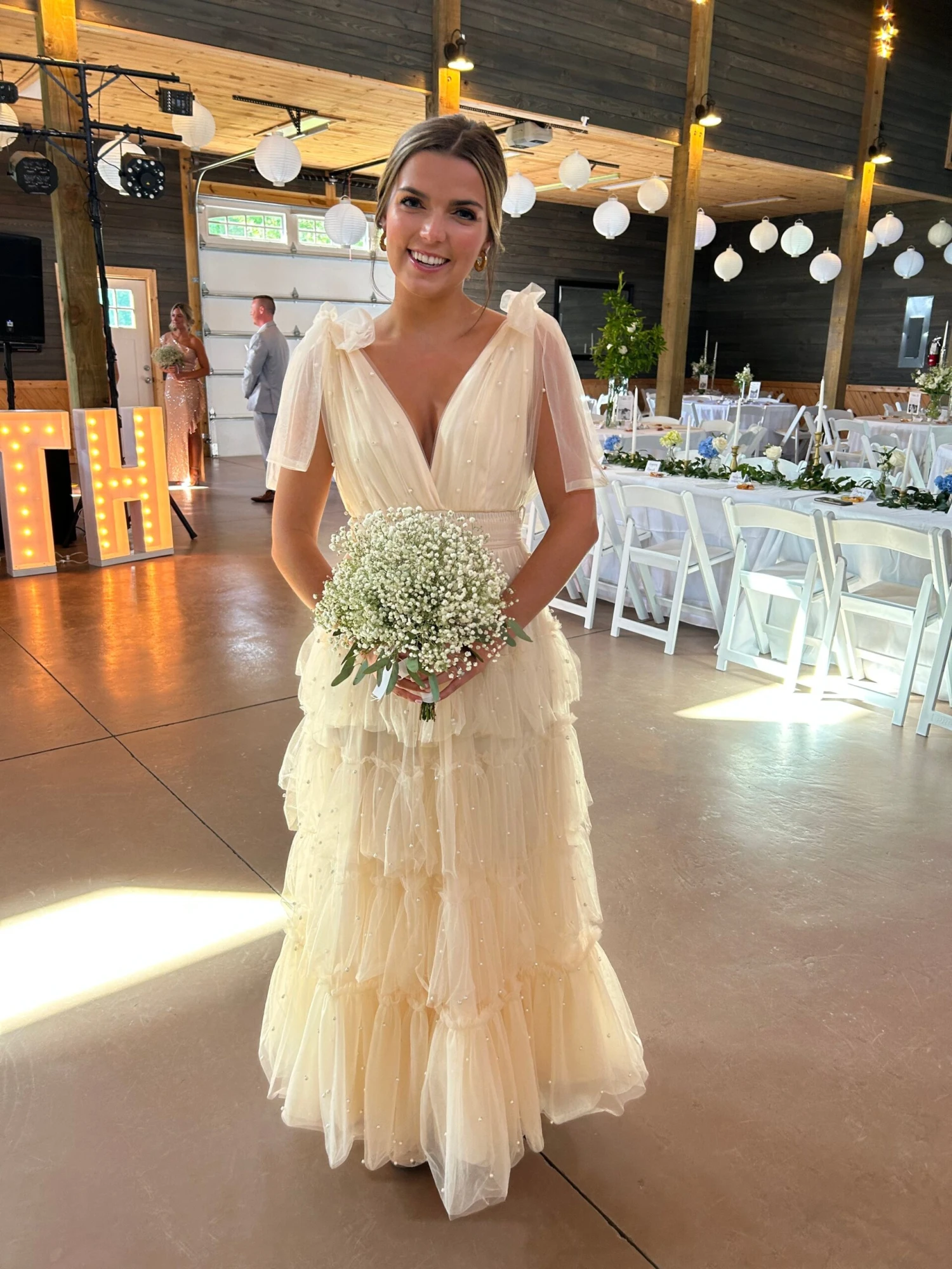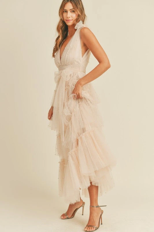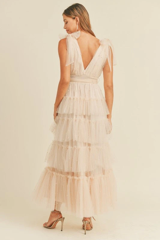 Pearl detailed mesh tulle v-neck tiered baby-doll maxi, self tie strap detailing. Smocked waistline, with bow tie. Mesh tinted blush. lined/poly/