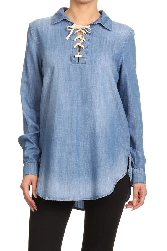 “Trendy Flowy Lace Up Denim Wash Blouse”