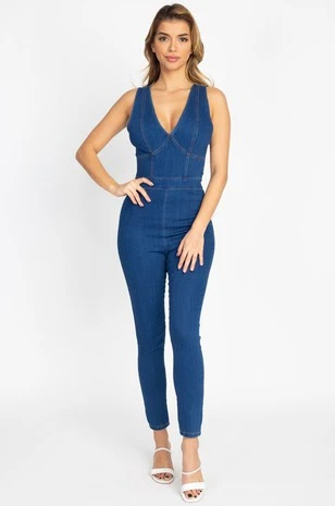 Denim V-Neck Skinny Jumpsuit