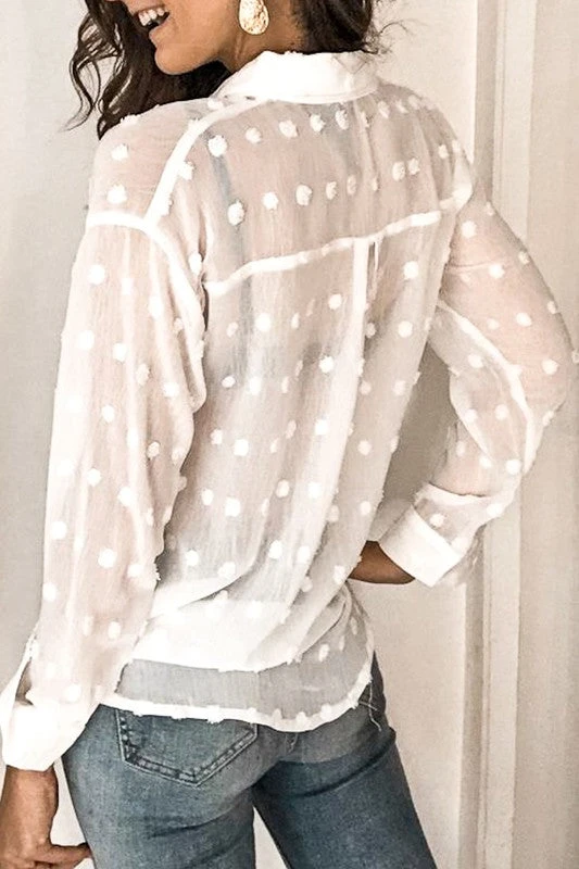 Darling dotted shirt has front summary down, loose fit ready for fall/winter/spring and summer. polyester