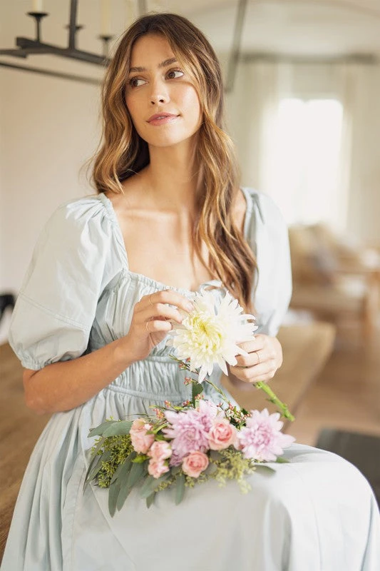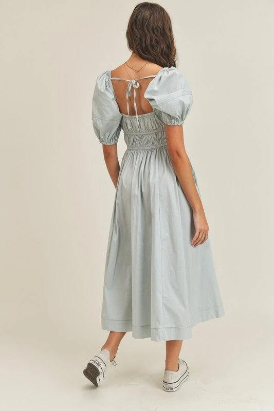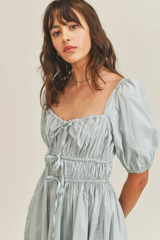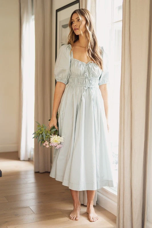 Puffed sleeves, square neckline with ruched shirring detail midi dress. With front drawstring detail. Back self tie. cotton