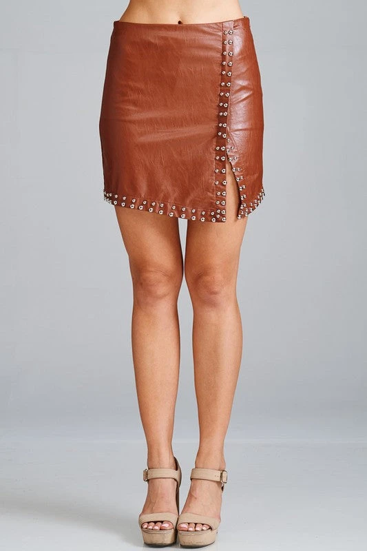 Faux Leather Studded Wrap Mini Skirt with side zipper. Front Slit.