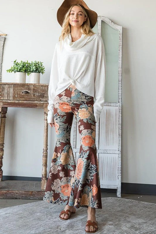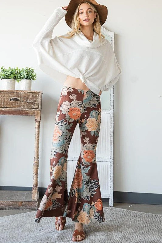 Brown floral high rise flare pants,Floral leaf print. poly/spandex