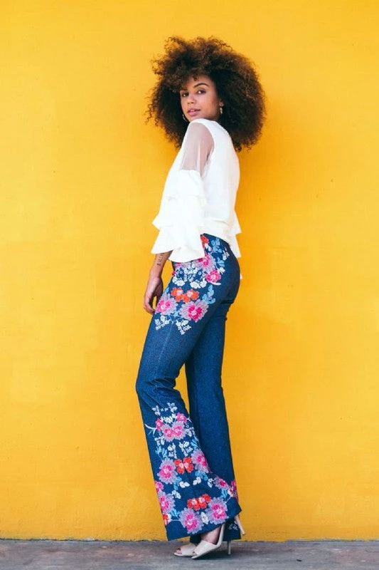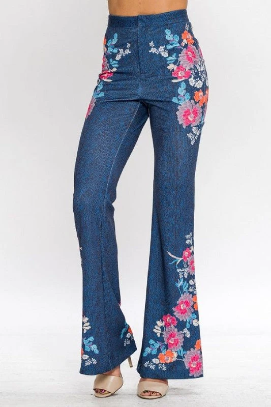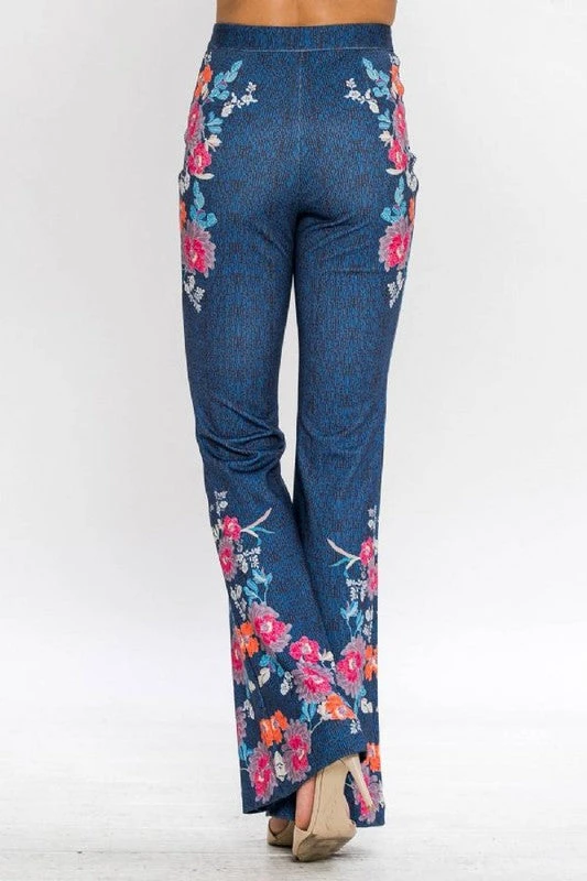 High Waisted Denim Print Hippie Pants, spandex/poly