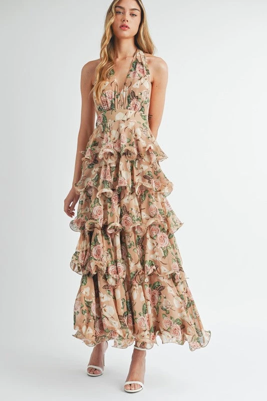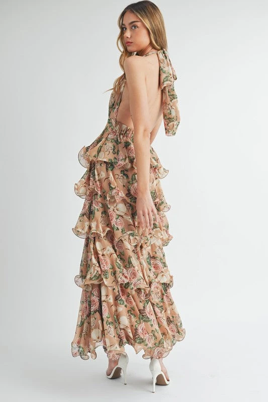 Ruffle tiered maxi dress with tie at halter. Elastic waistband and invisible zipper. lined/poly/model wearing a small