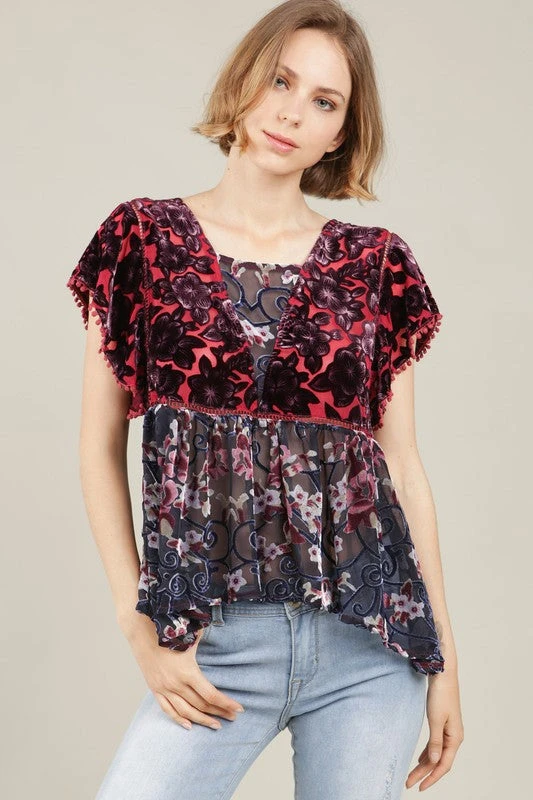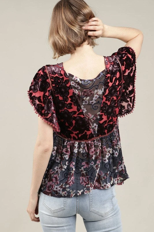 Floral Velvet Ruffle Sleeve Top with chiffon bottom. poly/velvet