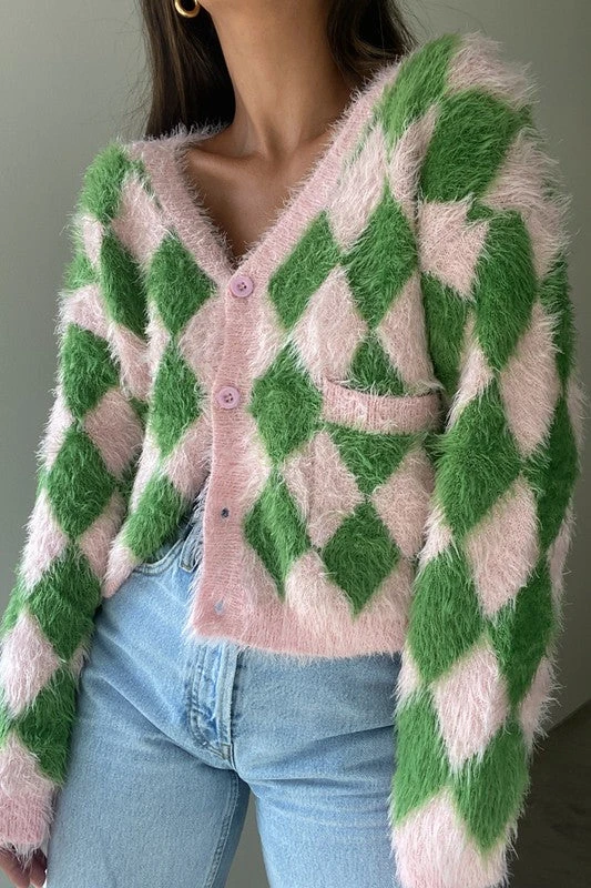 Brown fuzzy argyle cardigan. Acrylic/nylon (chocolate available)