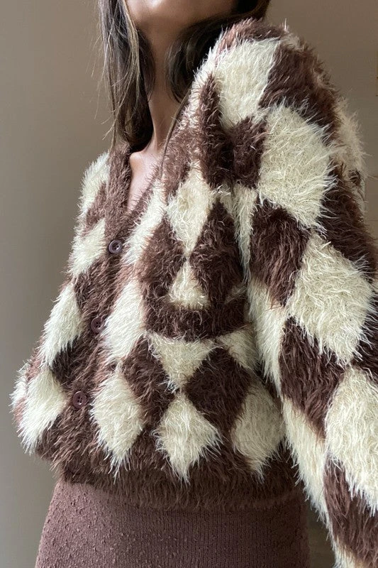 Brown fuzzy argyle cardigan. Acrylic/nylon (strawberry available)
