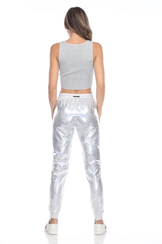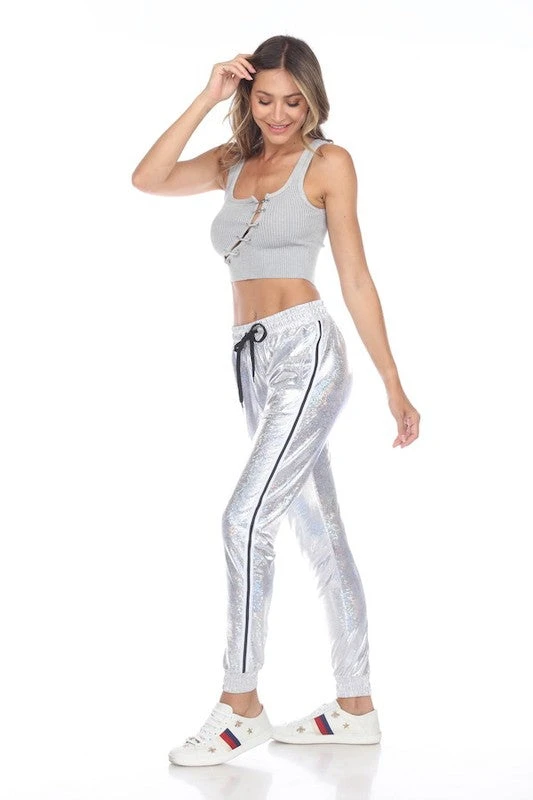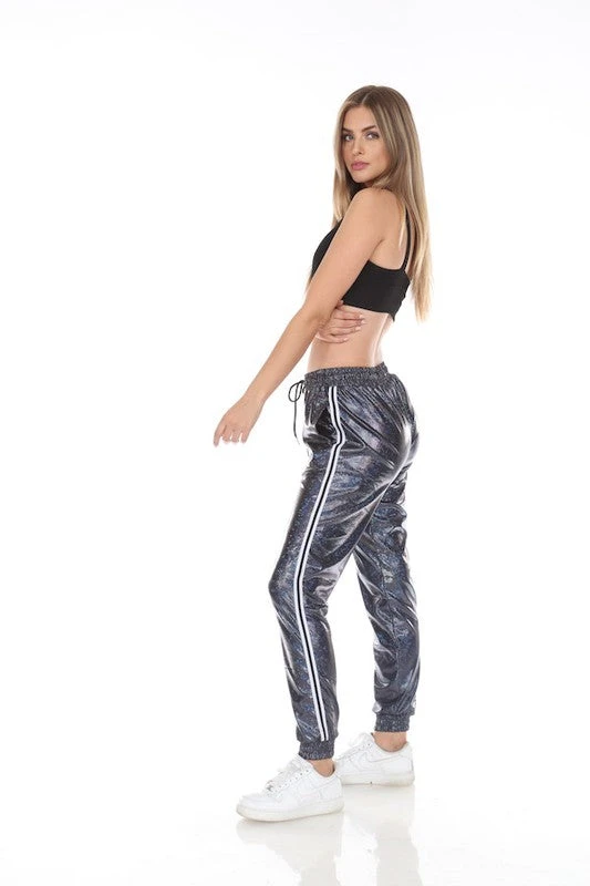 Our faux glitter joggers will make head turn, with iridescent impression and sports stripe on the side. With two side pockets and elastic waist. SILVER, PINK OR BLACK!!! poly/spandex