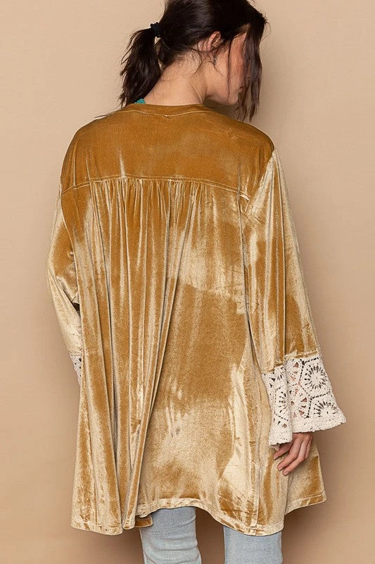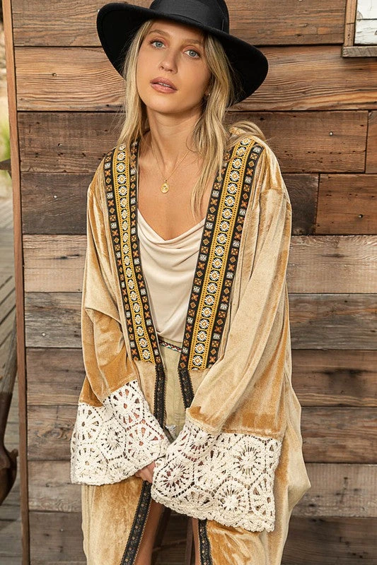 Flared sleeve regular fit long cardigan. Velvet with cotton cut and sew sleeve point, trim detailing, edge cut , solid color. /poly