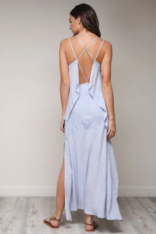 Romantic & Flowey This Hi-Low Ocean Blue Maxi printed open back scarf dress is airy and soft, with its flowing bottom and criss cross back its definitely for our feminine side. poly/rayon