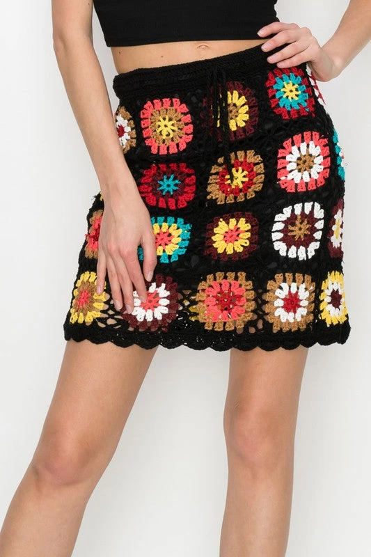 So special and one-of a kind this crocheted skirt features a classic multicolored stitched pattern, pull-on style stretch fit. Acrylic