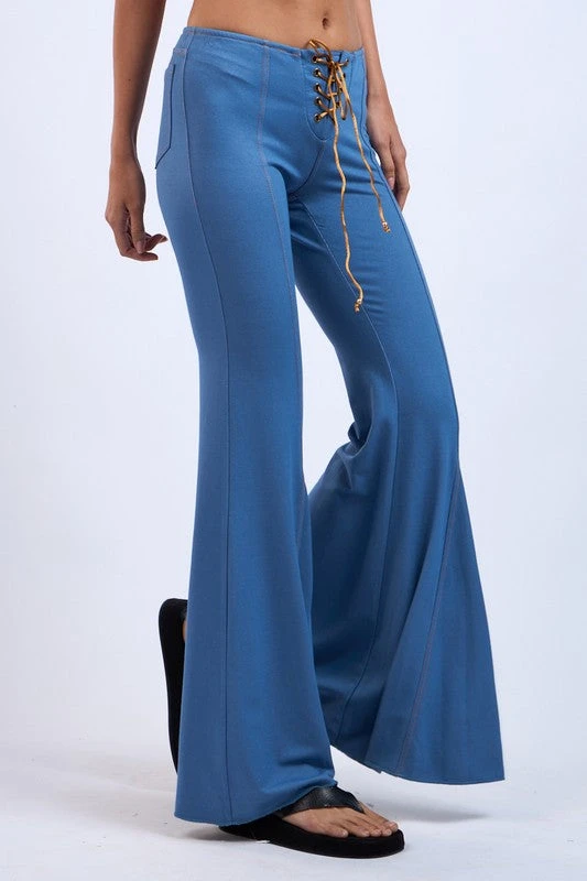 Vivid blue denim , satin rope tie with beads up front, wide leg. self/span/cotton/poly