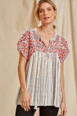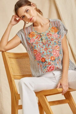 Cute embroidery top featuring round neckline and short sleeves.nylon
