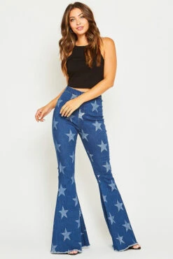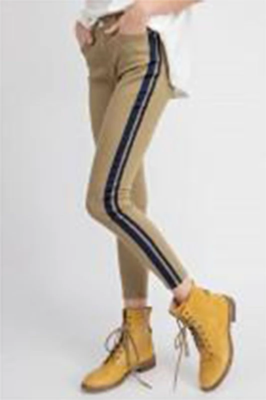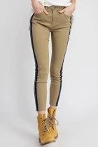 Stretchy Fit, Browse our Denim looks on line, these Khaki Denim Skinny Jeans w/navy stripe, 4 pockets, summary closure and zip fly model 5’10.small poly/spandex/cotton