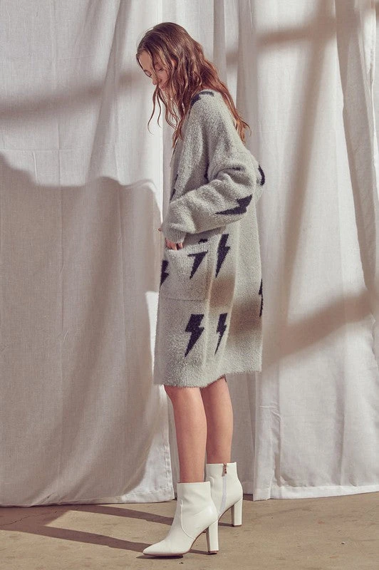 Long body over-sized cardigan, features a “Lightning Bolt” print and front pockets. nylon/acrylic