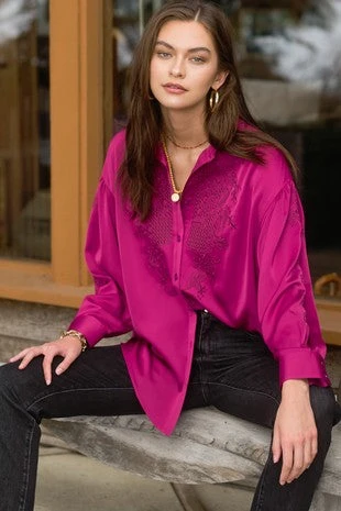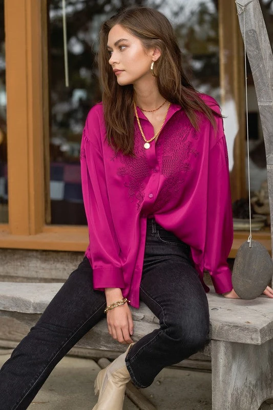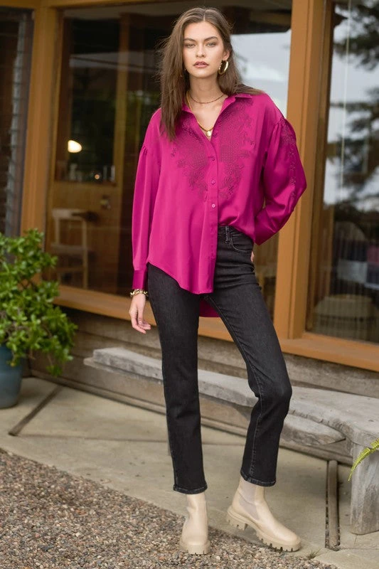 Silky Button down Blouse, embroidered on the center front, sleeve and back. Collar summary closure and wrist. (runs a bit larger)