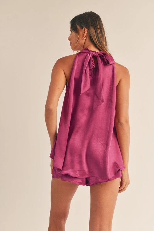 Solid satin halter neckline hi-low top with self tie neck closure and matching shorts, elastic waist. poly/spandex (also comes in black)