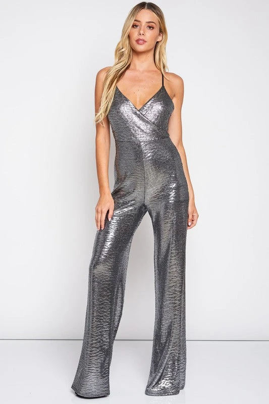 Are You Ready for a shitload of attention???Metallic silver glitter jumpsuit is ready for you to rock any room. poly/rayon Criss-Cross back and that glittery shine is unforgettable, funky, sophisticated!!