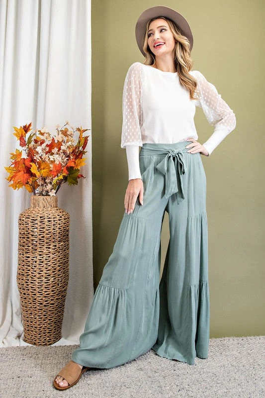 Wide leg pant with its tiered design with a smocked with a smocked waist and tie. (black available)rayon