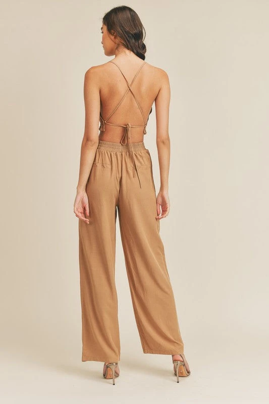 Halter ruched open back tie up crop top. Palazzo pants with elastic back detail. viscose,linen Also comes in black.
