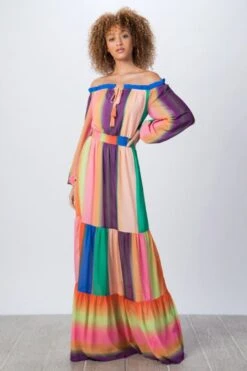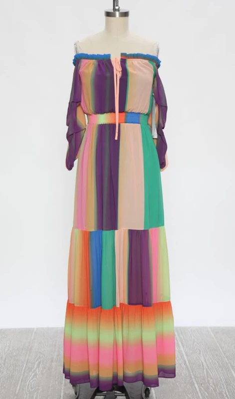 Multi-Color Maxi Dress is the most loveliest Maxi Dress! Woven Printed, featuring off the shoulder, mini ruffled edge, font tie, cinched wait, lined, tiered skirt. 100%poly/lining.