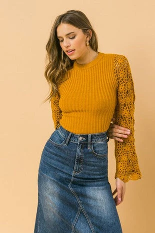Solid sweater top featuring round neckline, ribbed body and crocheted bell sleeves. acrylic