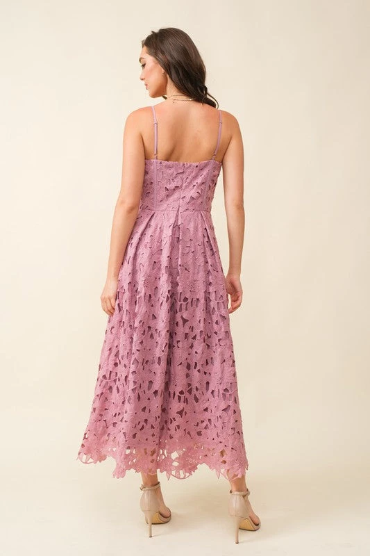 Lace A-linemidi dress, corset bodice. Lined with hidden back zipper and adjustable straps. spandex/poly