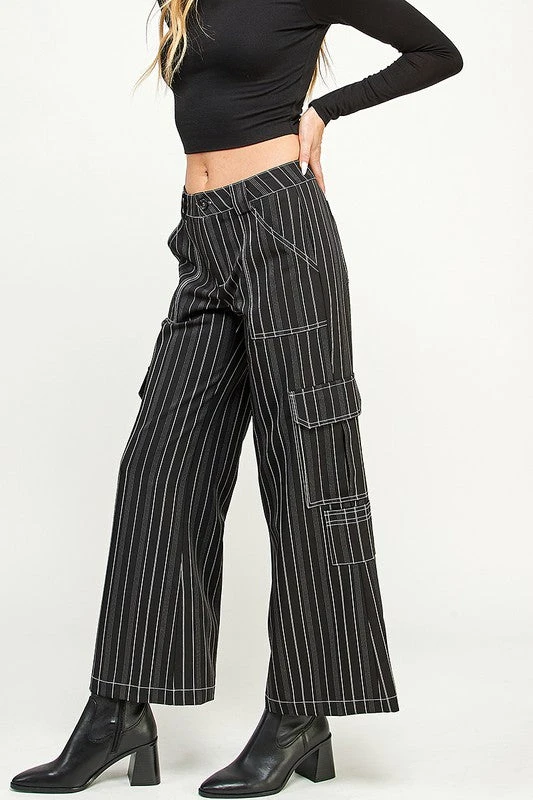 Cargo Pants mid-rise and wide leg. Zipped and fold over pockets, side and back pockets, hits just below the ankle. poly/spandex