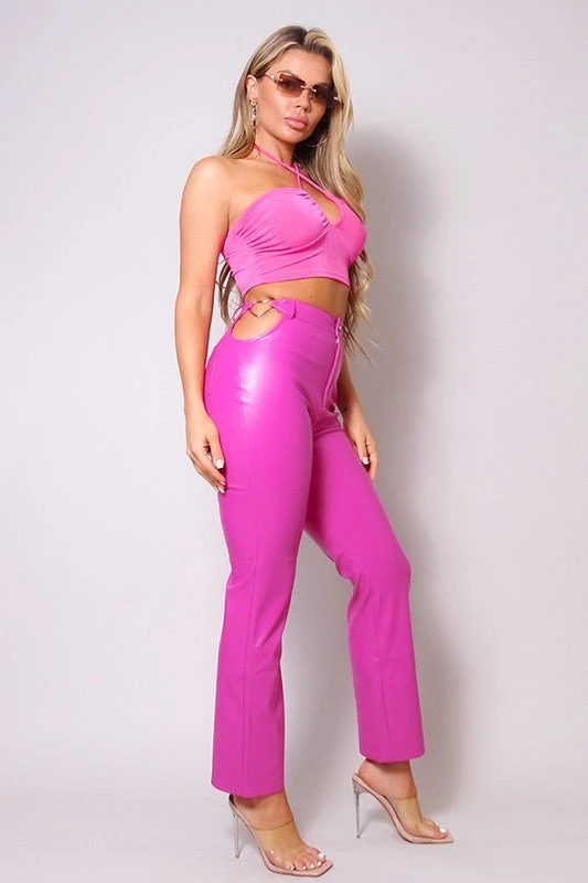 Side cutout heart ring leather pants. High waisted metal heart buckle on side detail. Back pockets, comfortable stretch soft slimming faux leather.