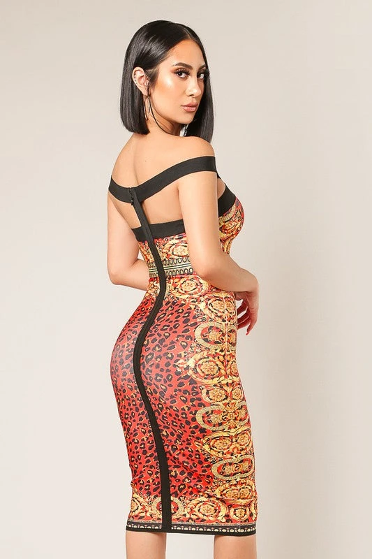 “Hot and Gorgeous”Leopard Bandage dress off the shoulder, full zipper forming pencil look is absolutely gorgeous a must have for every closet. Leopard bandage dress is ready for the Holidays! {cotton, polyester,acrylic } model wearing a small