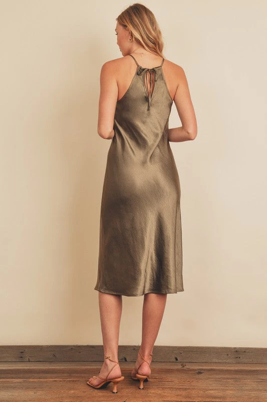 Satin Tie halter. Comes in Champagne, Olive, Black