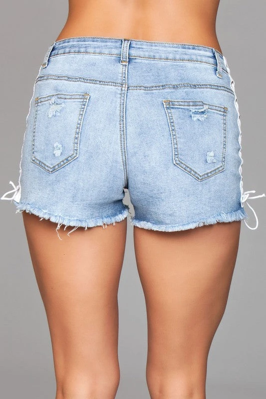 Light wash denim shorts, lace up detail and distressed on front and back, summary, zipper. (find under jeans)