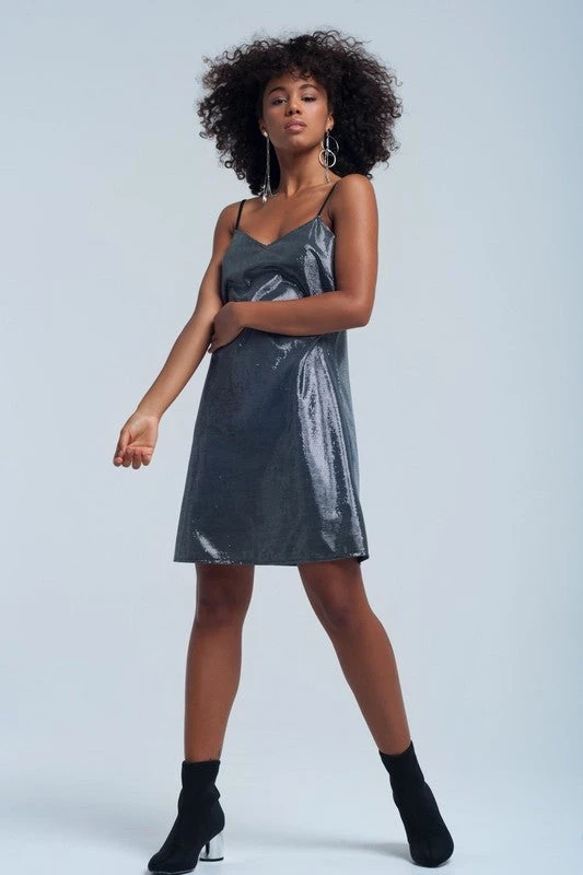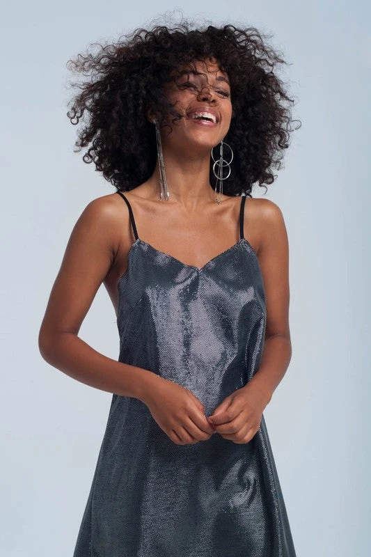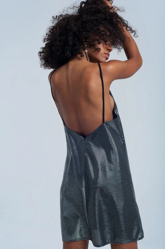 V-neck, spaghetti straps. the dress has a large open v-back. Woven fabric/poly (model wearing a small)Made in Italy