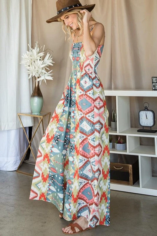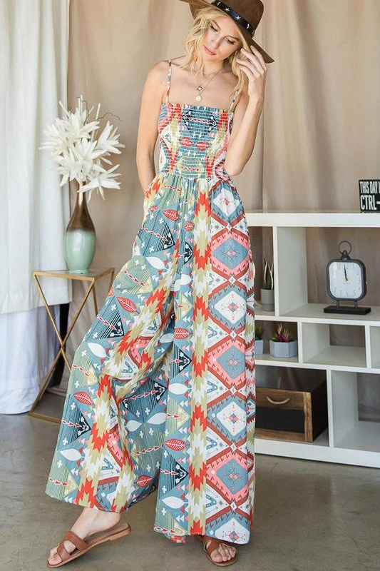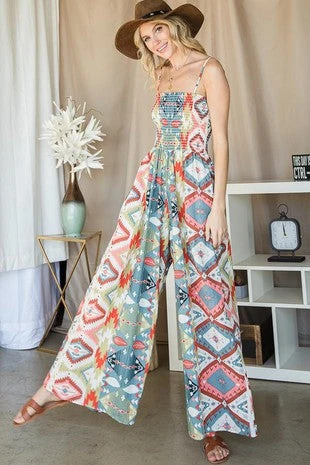 Smocked top, spaghetti straps, flared legs, and hidden side pockets. Poly/rayon.