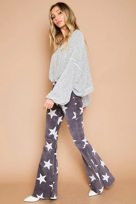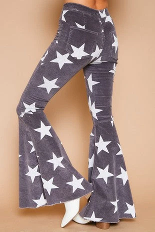 Star Printed Flare Pants in charcoal corduroy/spandex are high waisted/summary closure and very comfortable. Get the heads to turn with these sexy star pants, we are all really stars anyways!!
