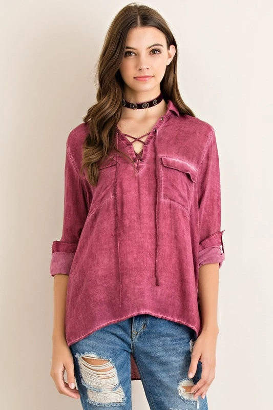 Stressed Wine Long Sleeve Blouse has a loose fit feeling. This blouse is a wonderful addition to any closet. It’s Front lace up adds great detail. Soft to the touch and sexy on all body types. Light weight .Also comes in grey. Rayon
